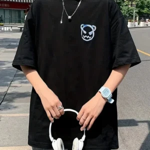 20/1 Penye Compack Bisiklet Yaka Kore tarzı sevimli ayı baskı Kısa Kol Erkek t-shirt – Siyah