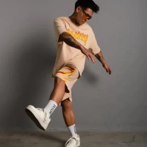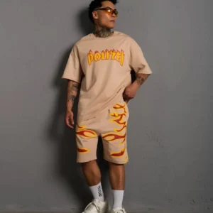 Erkek Alev Baskılı İkili Şortlu Takım – Bej