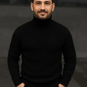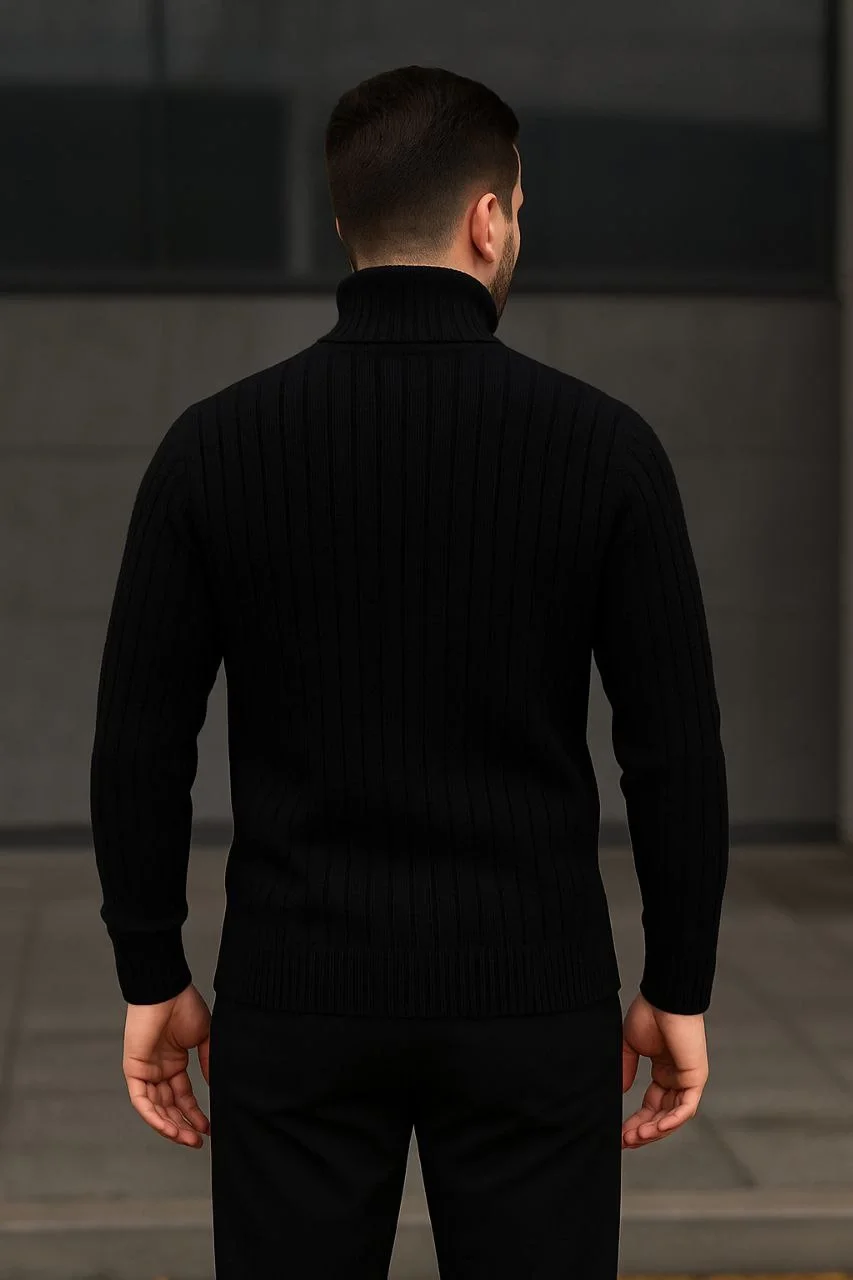 Erkek Balıkcı Yaka Bağazlı Triko Kazak Pamuklu Kalın Fitilli Dokuma, Regular Fit Uzun Kollu Kışlık Model – Siyah