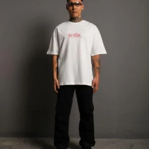 Erkek Oversize Tişört – Beyaz 24/1 Penye Kumaş, Bisiklet Yaka, Ön & Arka Baskılı, Streetwear Tarzı Rahat Büyük Kalıp T-Shirt- Beyaz
