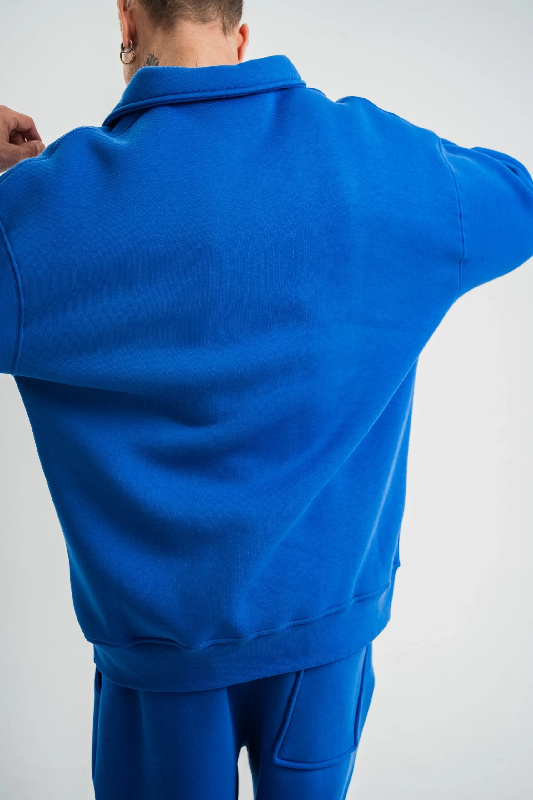 Erkek Patlı Yaka Üç İplik Pamuklu Sweatshirt Double Oversize Rahat Kalıp Günlük Kullanım – Mavi