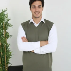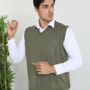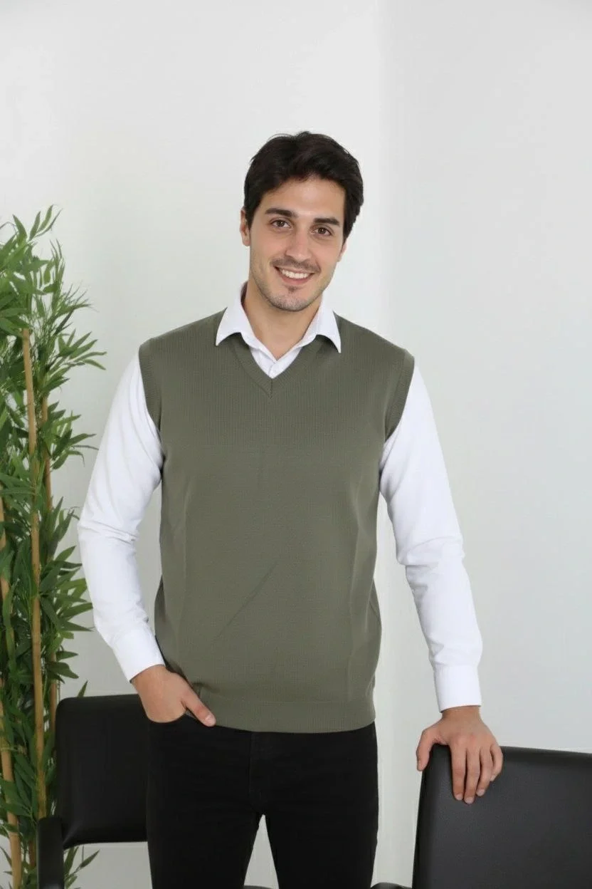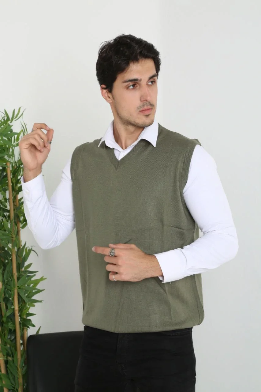 Erkek V Yaka Kolsuz Süveter Triko Kazak yumuşak dokulu Pamuklu ince Dokuma Rahat Regular kalıp – Haki