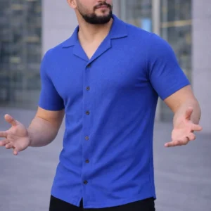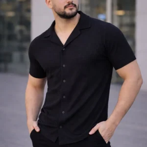 Erkek Waffle Dokuma Açık Yakalı Düğmeli Regular Kalıp 2’li Gömlek Seti – Siyah & Saks Mavisi