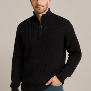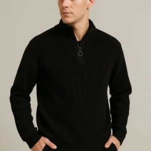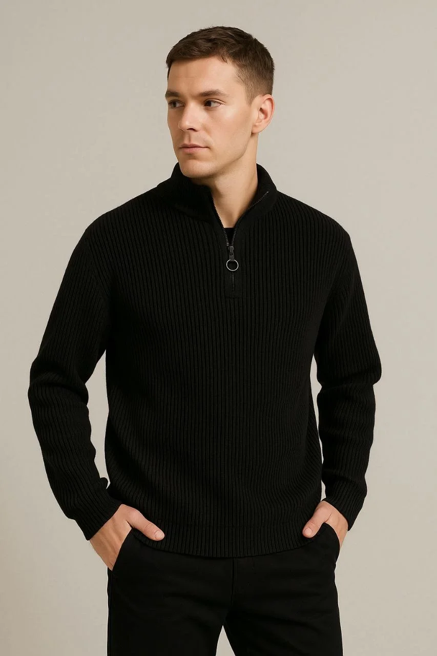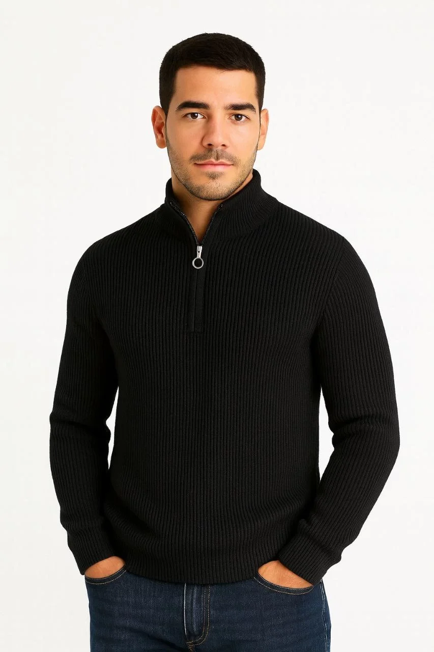 Erkek Yarım Fermuarlı Triko Kazak – Selanik Örgü, Dik Yaka, Pamuklu Dokuma, Regular Fit Uzun Kollu Kışlık Model – Siyah