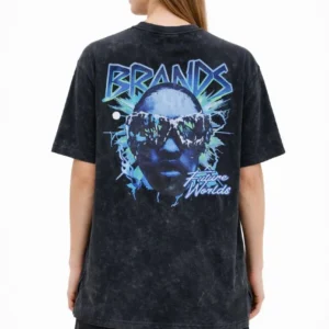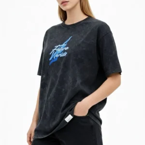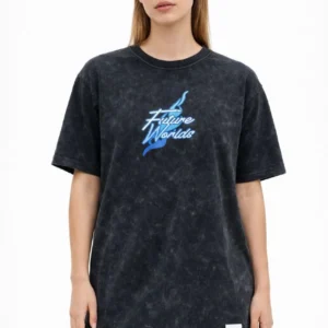 Kadın Asit Yıkamalı Oversize Tişört Future Worlds Baskılı Bisiklet Yaka Kısa Kollu Streetwear %100 Pamuk Street Style T-Shirt – Siyah