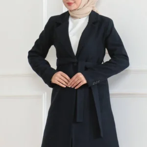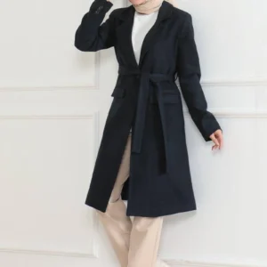 Kadın Kaşe Kaban – Uzun Boy Kruvaze Yaka, Kuşaklı Tesettür Kışlık Kaban, Astarlı Şık Yünlü Dokuma Oversize Rahat Kalıp, Cepli Modern Kaşe Mont Modeli – Lacivert