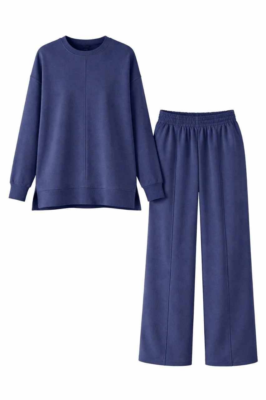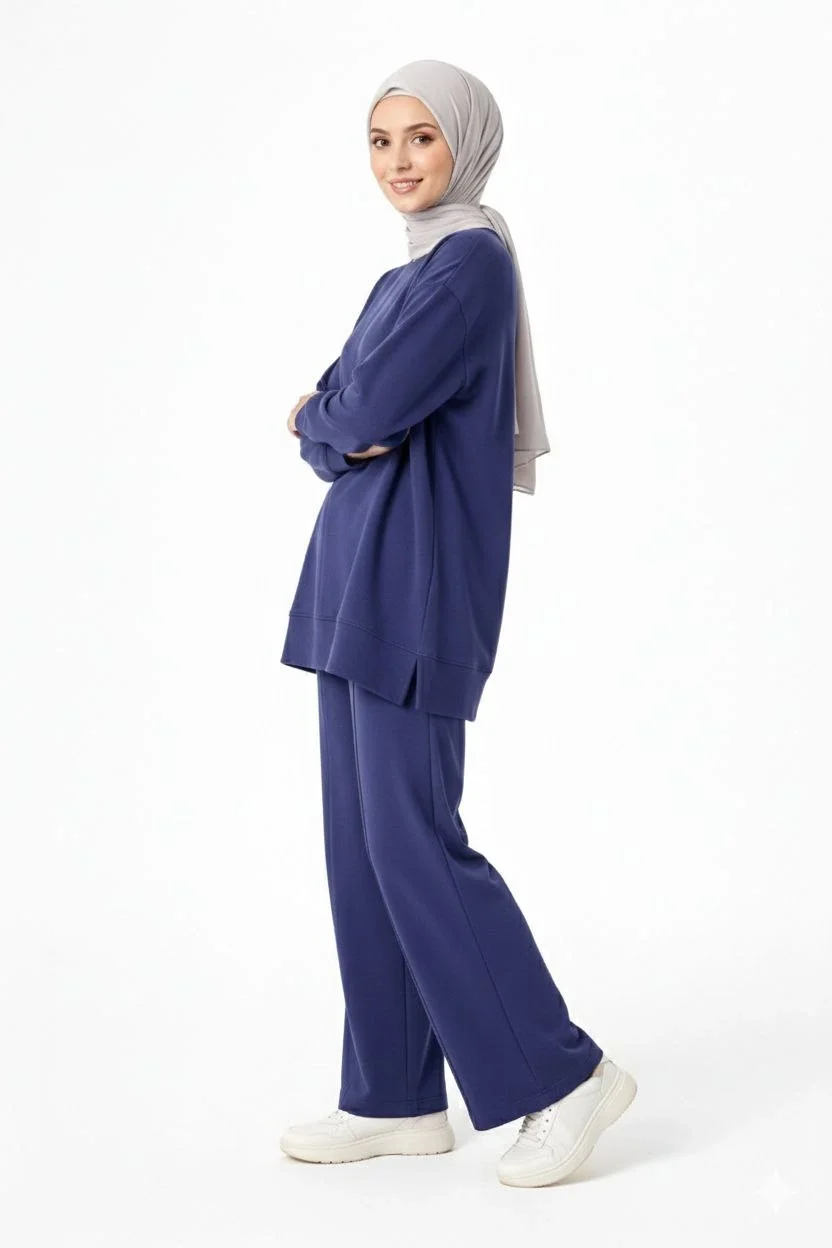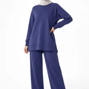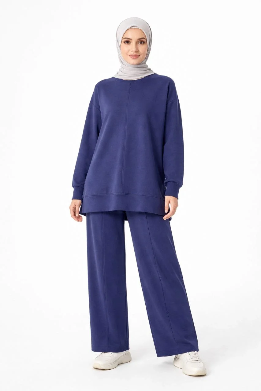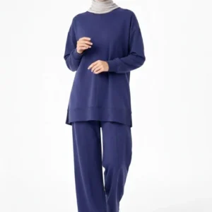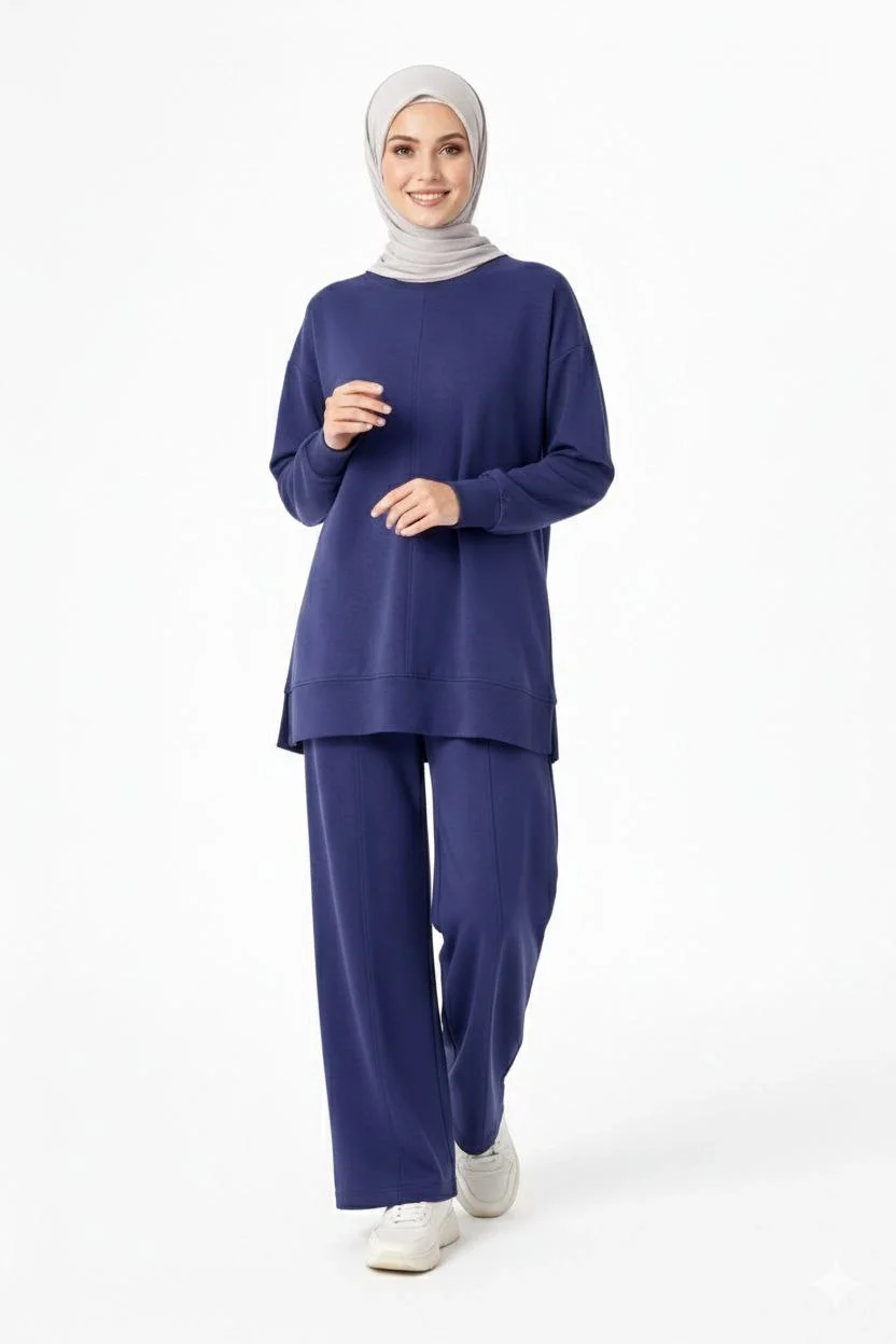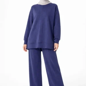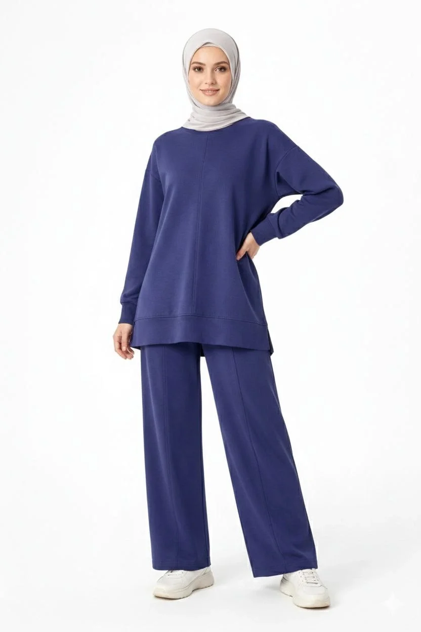 Osy Modal yumuşak dokulu Kadın Tesettür İkili Takım Yan Yırtmaçlı Uzun Tunik ve Düz Paça Pantolon, Salaş Kalıp – Lacivert