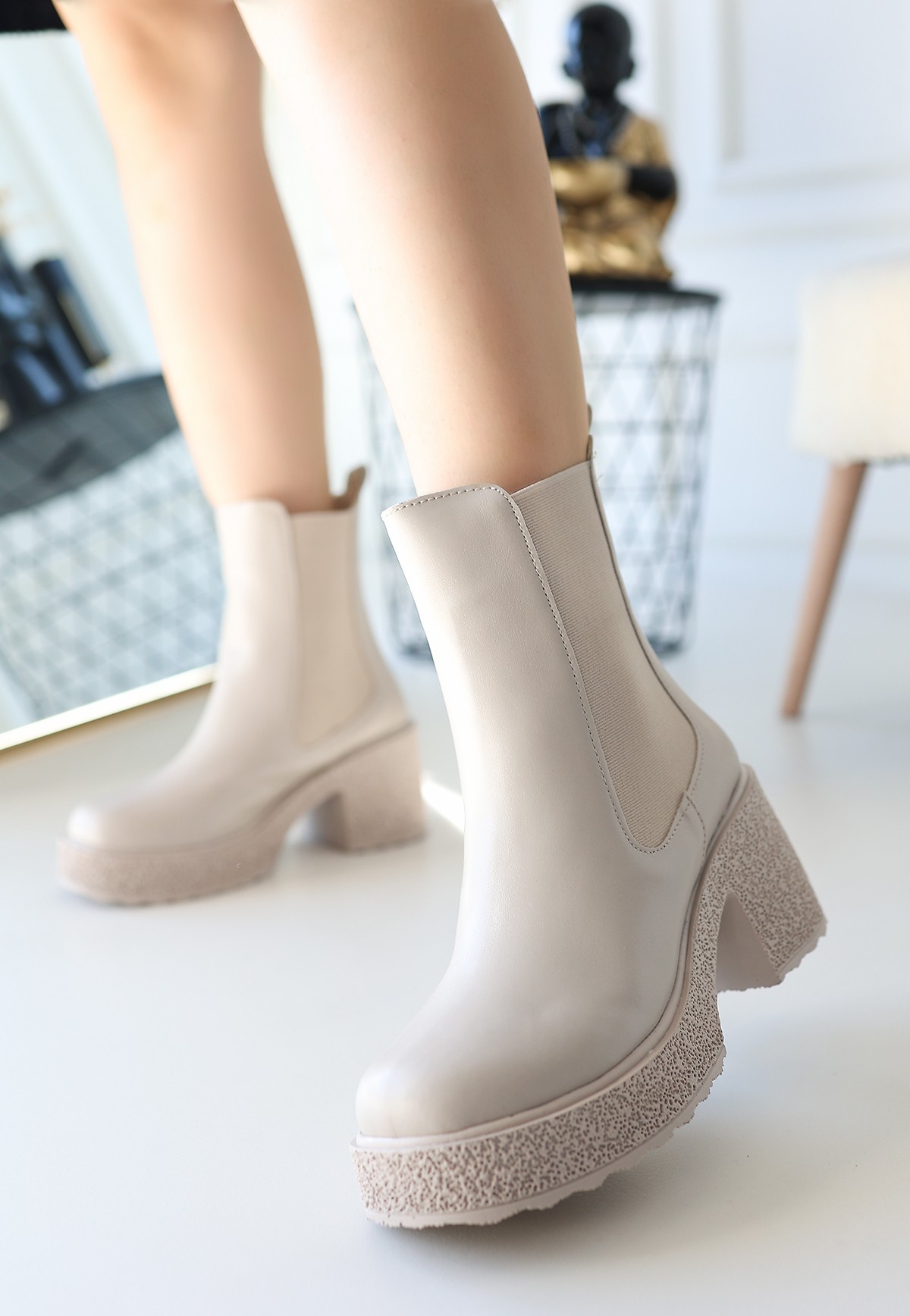 Paigo Bej Cilt Topuklu Bot