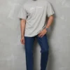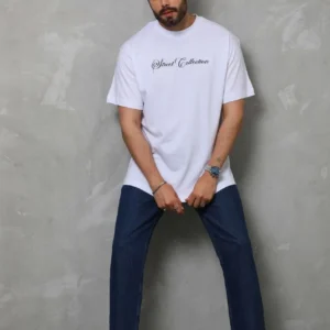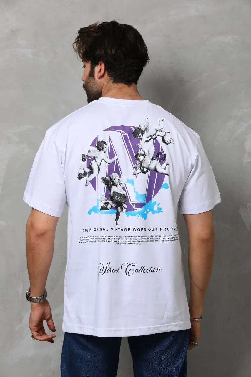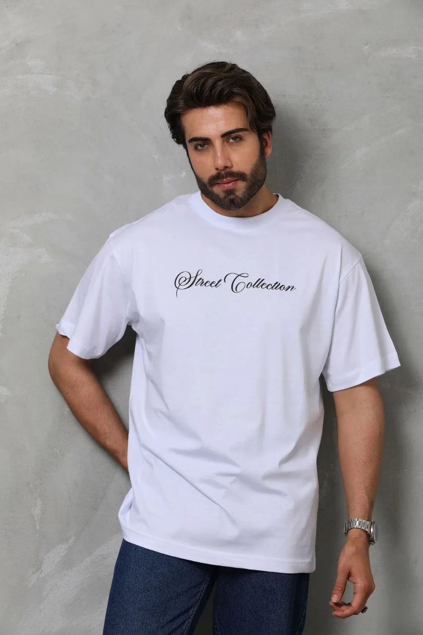 Unisex Bisiklet Yaka Baskılı Oversize T-Shirt – Beyaz