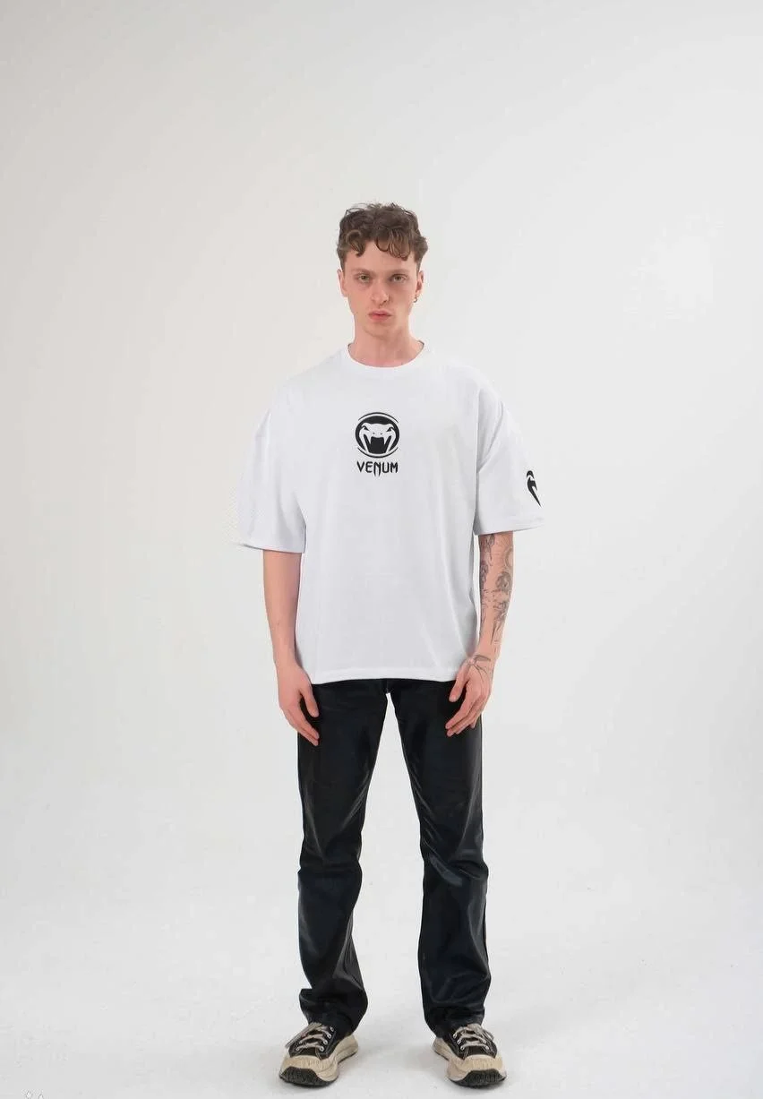 Unisex Bisiklet Yaka Baskılı Oversize T-Shirt – Beyaz