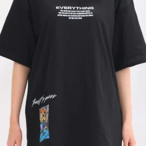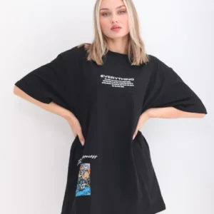 Unisex Bisiklet Yaka Baskılı Oversize T-Shirt – Siyah