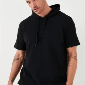 Unisex Kapşonlu Kısa Kol Düz Oversize T-shirt – Siyah