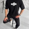 Unisex Kapşonlu Kısa Kol Oversize Baskılı T-Shirt – Siyah