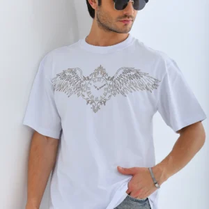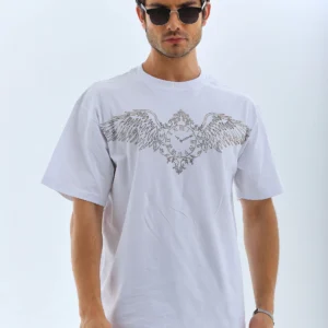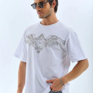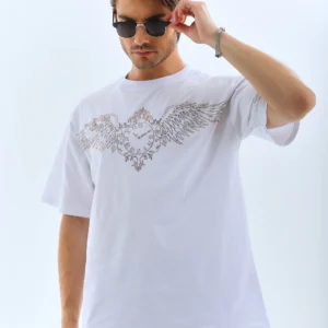 Unisex Oversize Taşlı Bisiklet Yaka T-Shirt – Beyaz