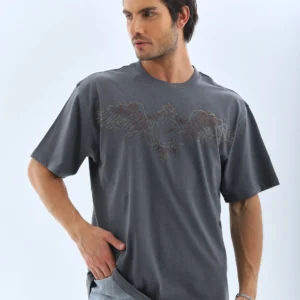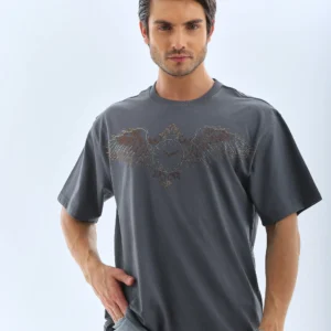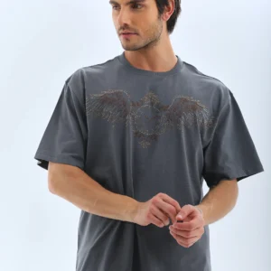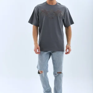 Unisex Oversize Taşlı Bisiklet Yaka T-Shirt – Füme