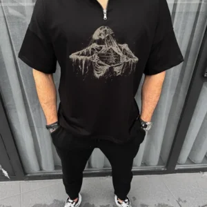 Unisex Yarım Fermuarlı Baskılı Oversize T-Shirt – Siyah