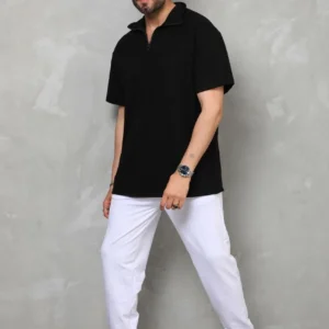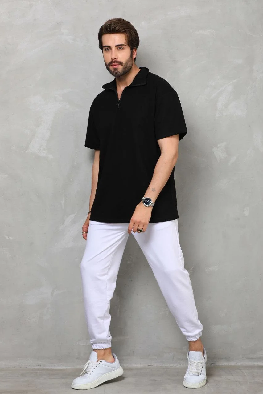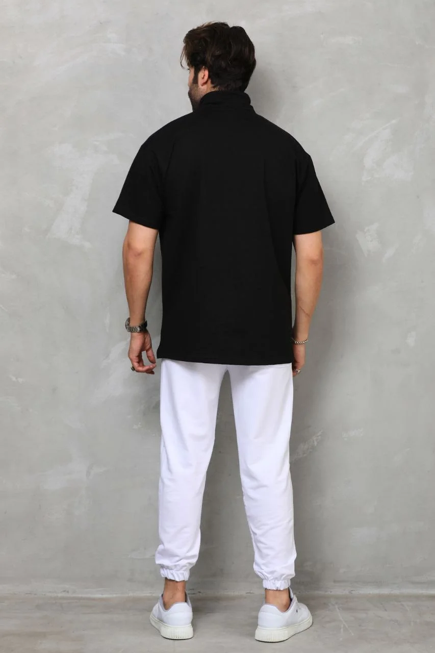 Unisex Yarım Fermuarlı Düz Oversize T-shirt – Siyah